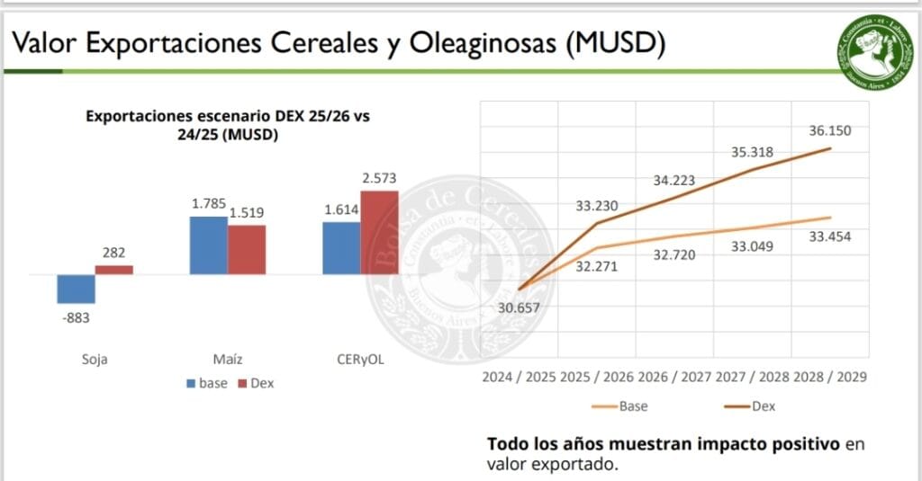 También el valor de las exportaciones de cereales y oleaginosas mostraría un impacto positivo en todos los años.