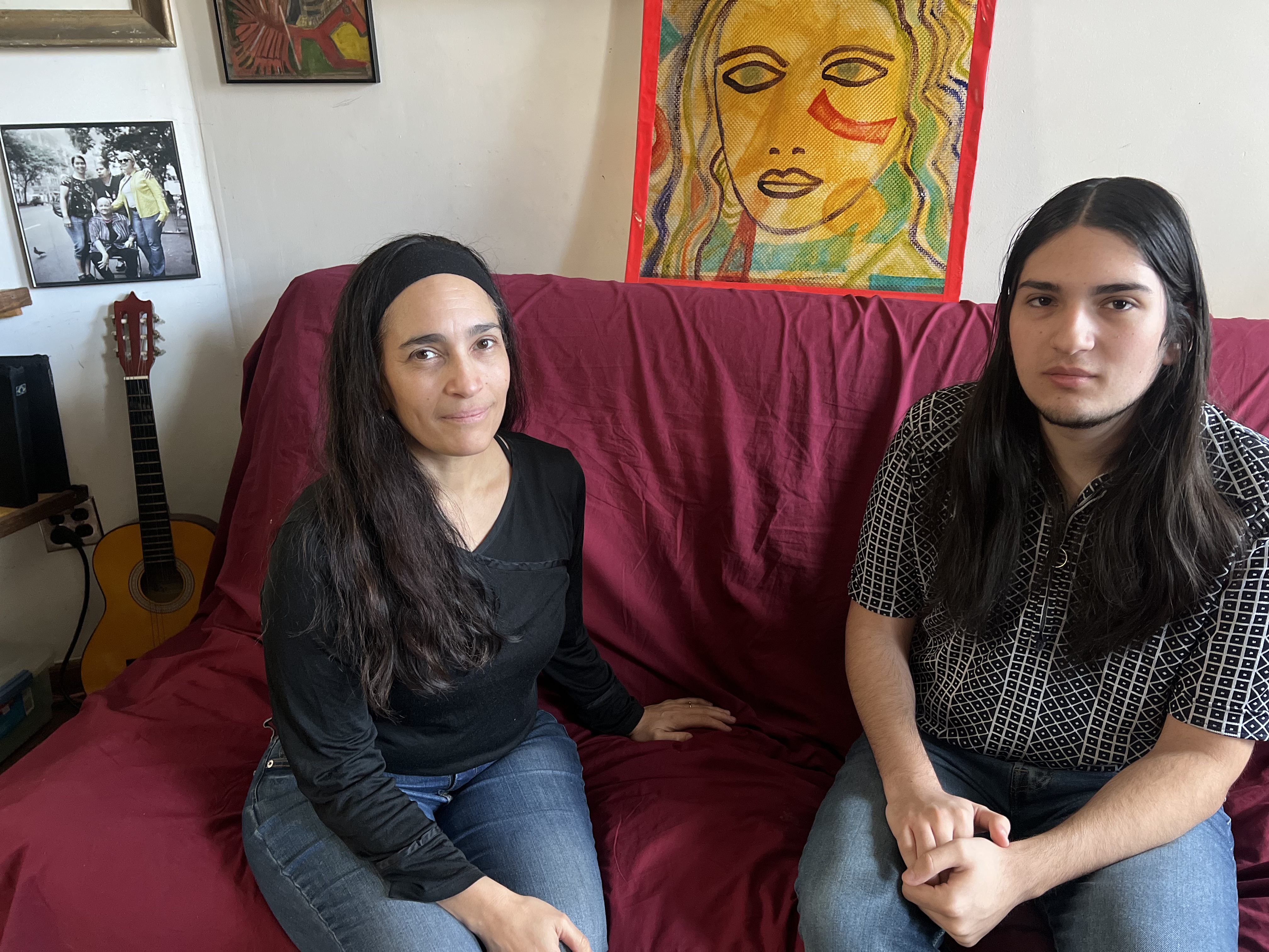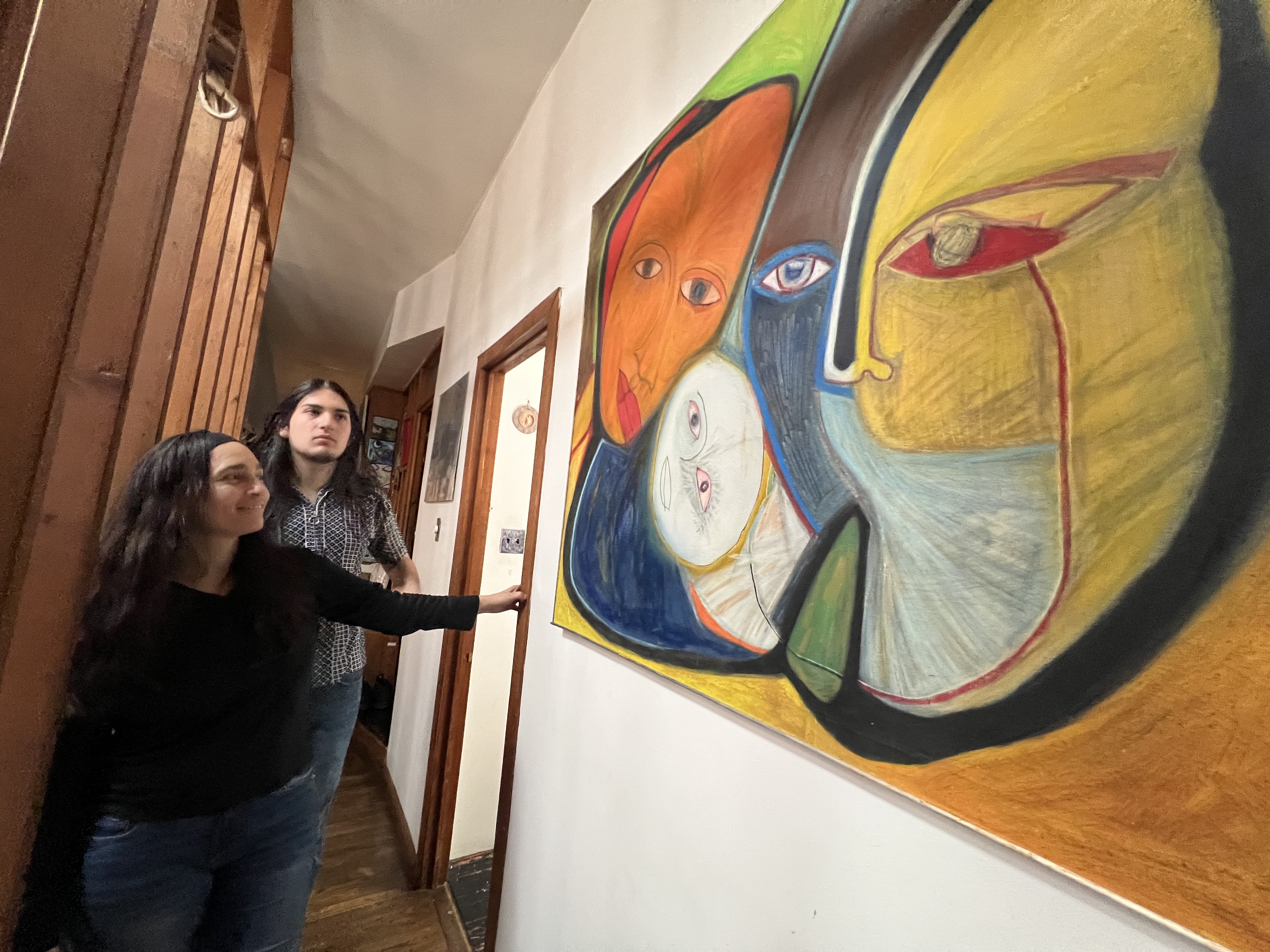 Jennifer Pliego, esposa de Palombo, y su hijo menor, Nichiren Nahuel Palombo muestran un cuadro de Bernardo, titulado La familia. Foto: Edwin Martinez