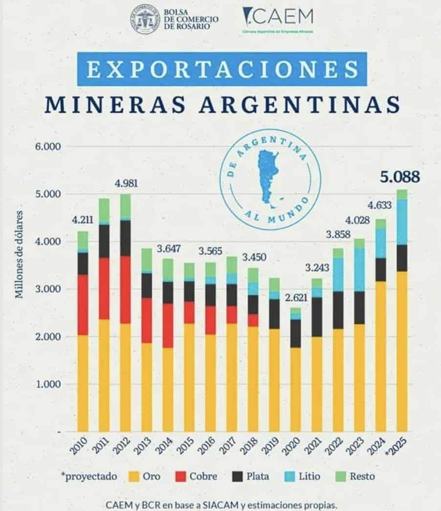 Las exportaciones mineras argentinas podrían crecer 14% en 2025 y se alcanzaría un récord en dólares de 5.088 millones según un informe realizado por la CAEM y la BCR.