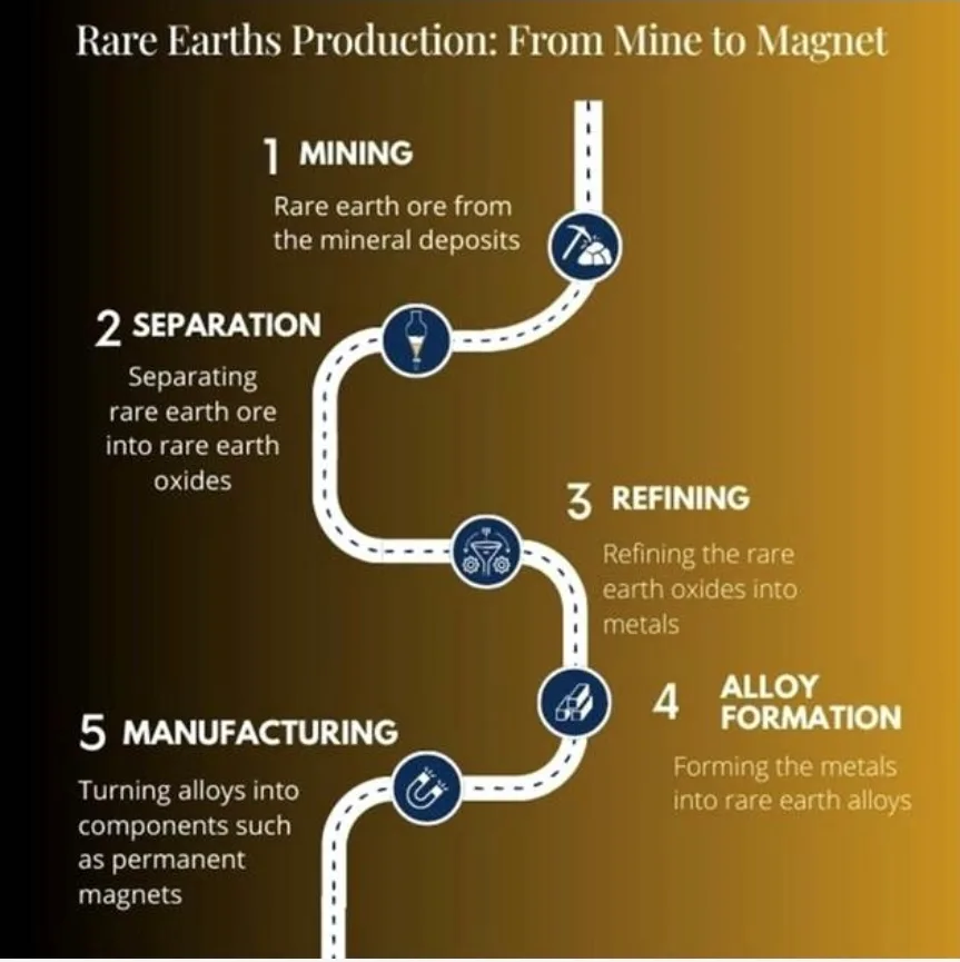 Esto incluye la separación y el refinado de tierras raras extraídas en EE.UU., así como el desarrollo de procesos posteriores en Estados Unidos necesarios para convertir estos materiales refinados en metales y, posteriormente, en imanes.